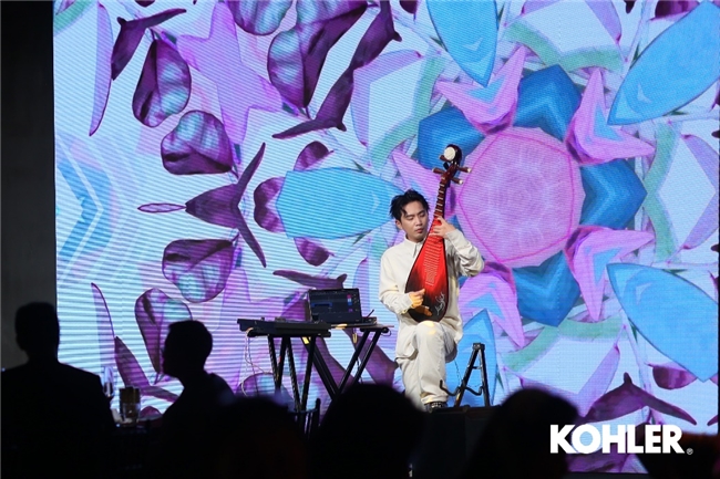 晚宴现场刘家良琵琶演绎融合现代电子乐与科勒艺术台盆纹路图案交相辉映