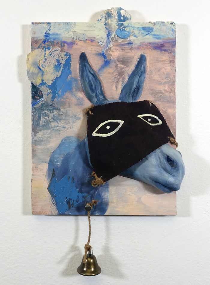 Mr. Donkey Messed Up,14” x 17”,Oil, nail, jute twine, and bell on board,2024