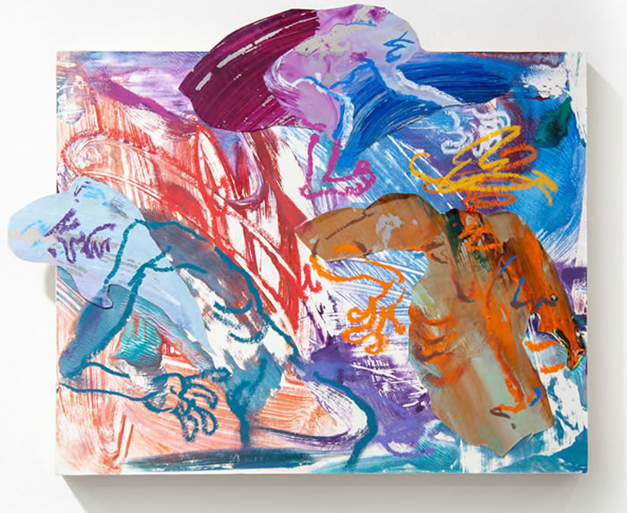 除此之外,他还通过拼贴元素进一步打破作品的边界:调色盘残骸被剪裁为不规则形状,转印复刻的亚克力版在肢解后被嵌入画面……龚若愚形容自己的创作为一种冥想与内观:“脑海中的场景就如同拼贴一样从来不是规则的,它的形状正契合了我的情绪边界。”