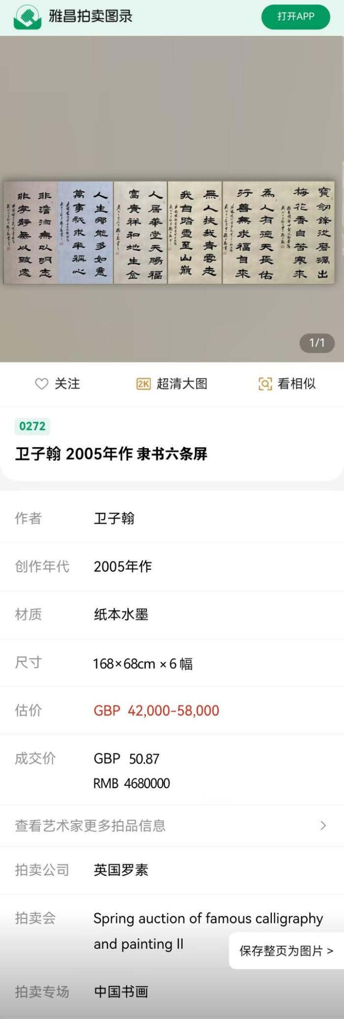 卫子翰作品在国内外重要拍卖会上屡创高价,确立了其在当代书法市场的重要地位: