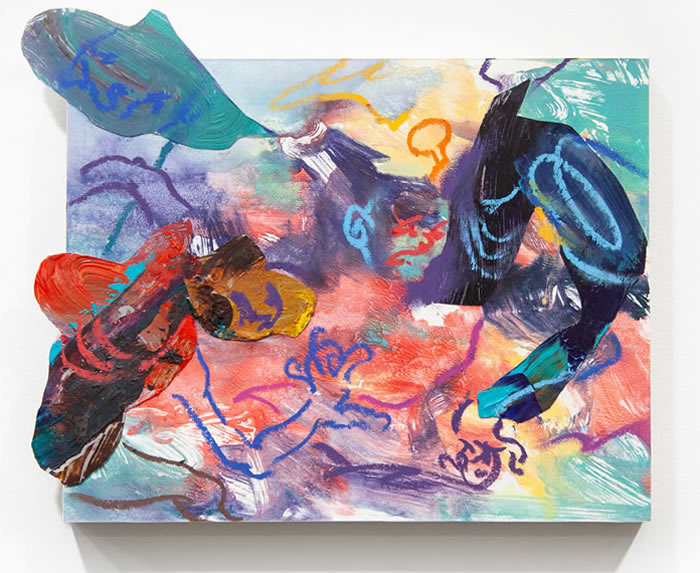 除此之外,他还通过拼贴元素进一步打破作品的边界:调色盘残骸被剪裁为不规则形状,转印复刻的亚克力版在肢解后被嵌入画面……龚若愚形容自己的创作为一种冥想与内观:“脑海中的场景就如同拼贴一样从来不是规则的,它的形状正契合了我的情绪边界。”