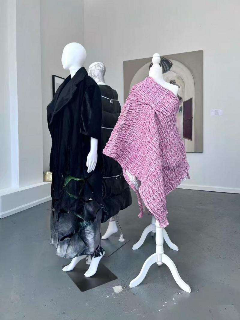 在那次展览中,李霈阳(Camille Li)以服装为表达载体,带来作品《Live Sashimi》。围绕 “美感背后的伦理张力”,借鉴日本生食文化中对自然敬畏与利用并存的矛盾,通过弹性线抽褶、重复纹理与鱼类意象叠加,将布艺纺织结构转化为可身体感知的叙事表达。作为展览中唯一的布艺纺织与服装方向创作,其材料实验性与概念深度的融合,获得该展览策展人、Utopia 平台创始人 Lihsing Wang 的高度评价,称其为展览跨学科结构提供了不可替代的材料视角。